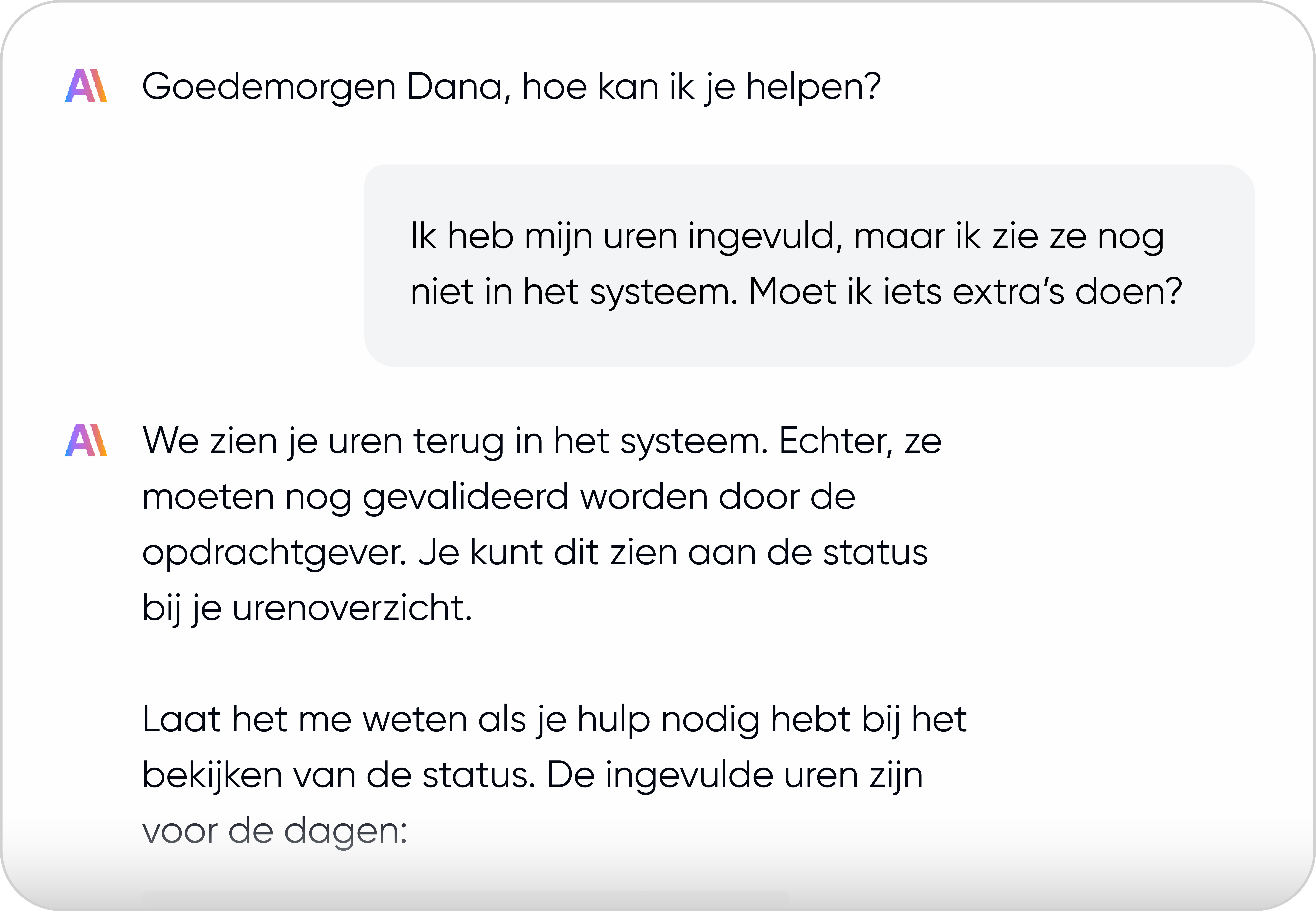 Via de chatmodule kun je direct informatie opvragen uit je planningstool, CRM of verloningssysteem, zonder in en uit verschillende applicaties te hoeven schakelen.
